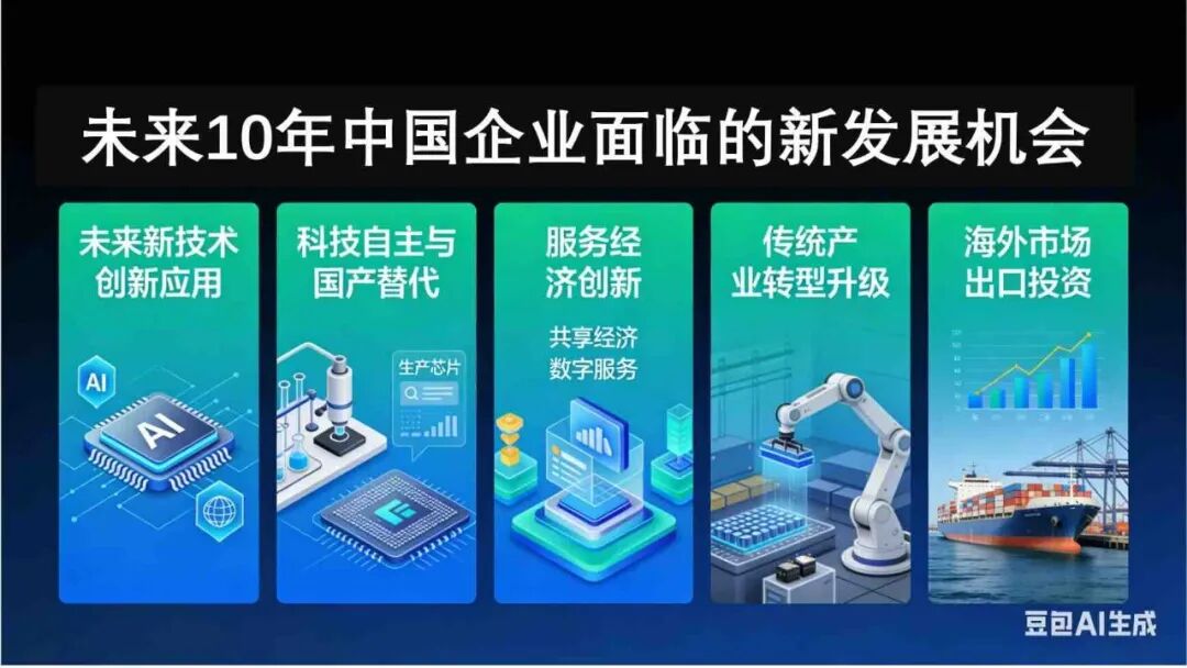 未来 5-10 年,我国企业面临的新发展机会主要集中在新技术创新应用、科技自主与国产替代、服务经济创新、传统产业转型升级、海外市场出口投资五大领域。