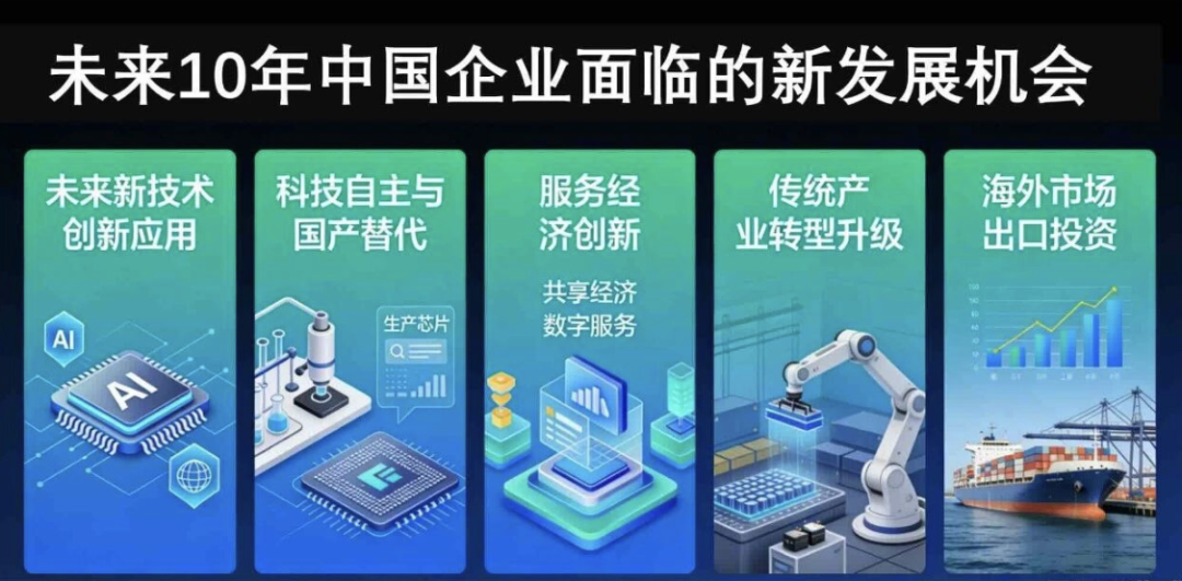 未来 5-10 年,我国企业面临的新发展机会主要集中在新技术创新应用、科技自主与国产替代、服务经济创新、传统产业转型升级、海外市场出口投资五大领域。